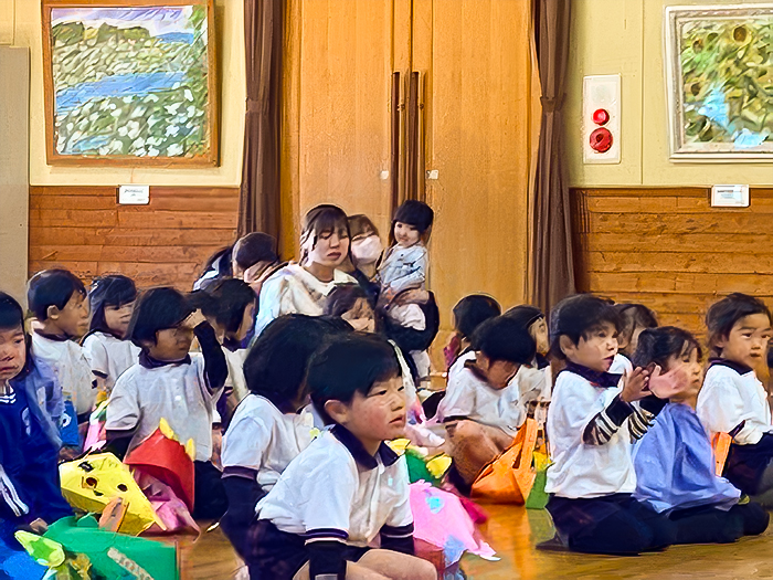 副園長先生から清涼幼稚園の節分のお話しをしてもらいました。鬼はどこにいるのかな?「おなか!」「洞窟!」と教えてくれました。
