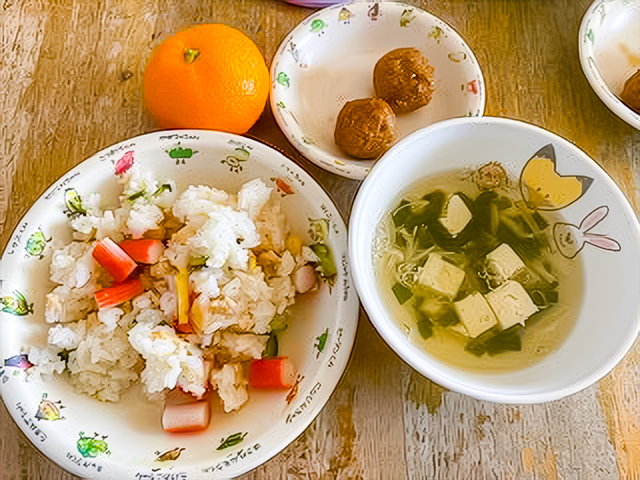 給食の先生達が、大きな器に盛りつけてくださいました。スープや肉団子もついて、おいしいお昼のランチでした。