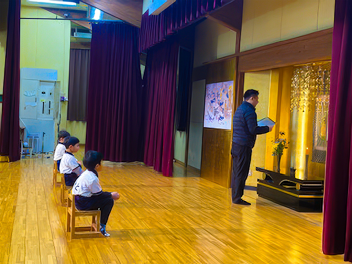 清涼幼稚園、ルンビニ保育園、もちお保育園のお友達と、ご本堂でのお仏参。ビデオシアターのお話しを聴きました。